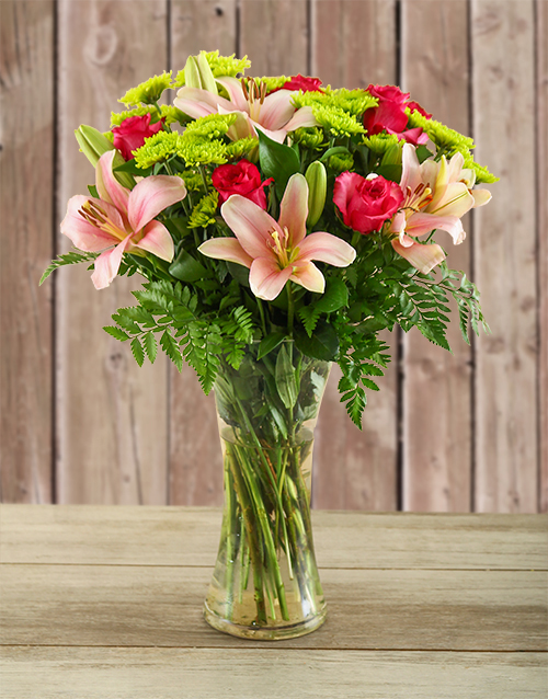 Mother’s Day Pretty In Pink Lilies and Cerise Roses in a Vase