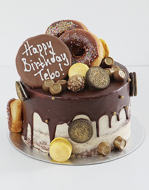 Personalised Gold Chocolate and Doughnut Drip Cake